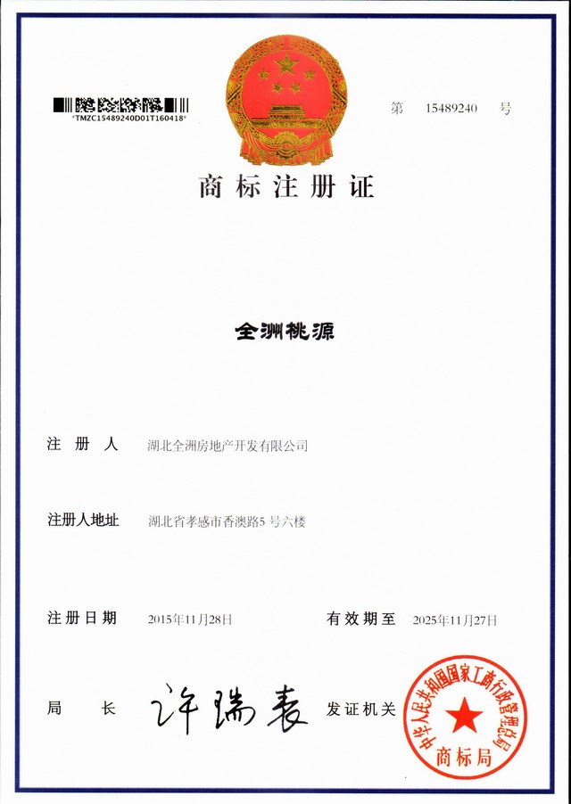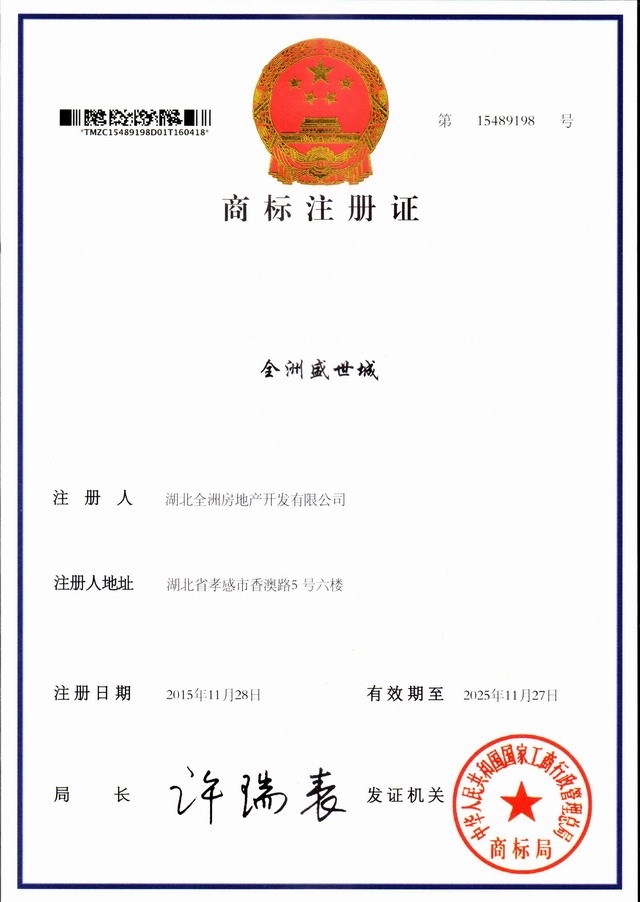 近日,湖北全洲房地产开发有限公司向国家工商行政管理总局商标局申请的“全洲印”、“全洲桃源”、“全洲盛世城”等三个商标获得批准,注册成功。三个商标的核定使用商品/服务项目均为第36类(房地产方面),有效期均为10年。